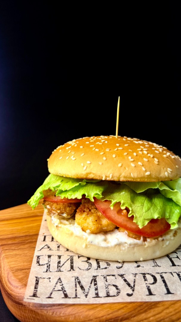 Стрипсы куриные, помидоры, салат айсберг, соус чесночный, булочка с кунжутом.