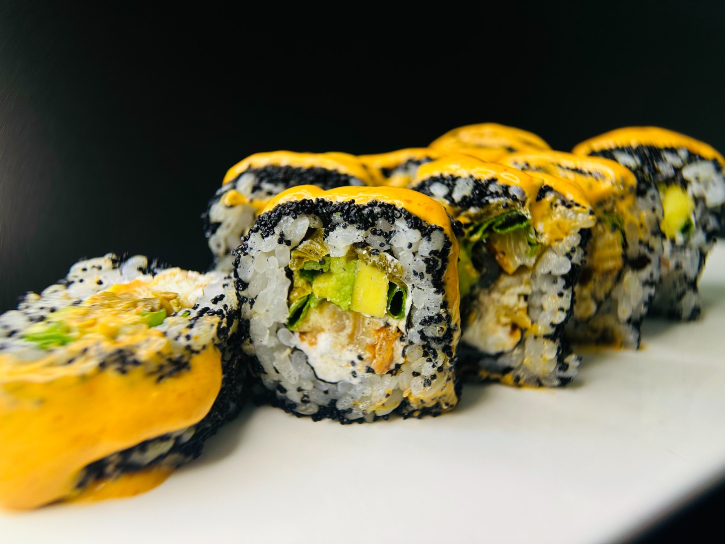 угорь жареный, сыр творожный крем-чиз, авокадо, лук зеленый, халапеньо, икра масаго, сверху: соус спайси. вес: 210 грамм