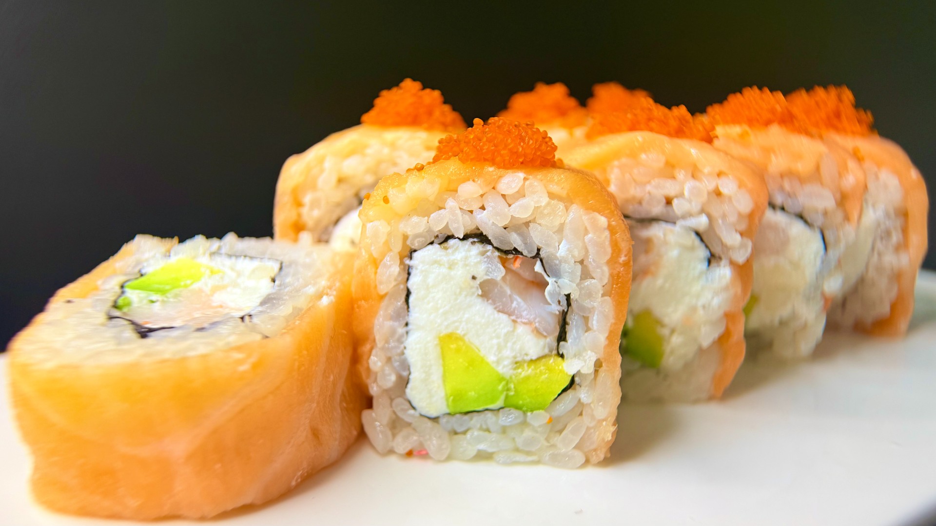 лосось охлажденный, креветка тигровая, сыр творожный крем-чиз, авокадо, сверху: икра масаго. вес: 244 грамм