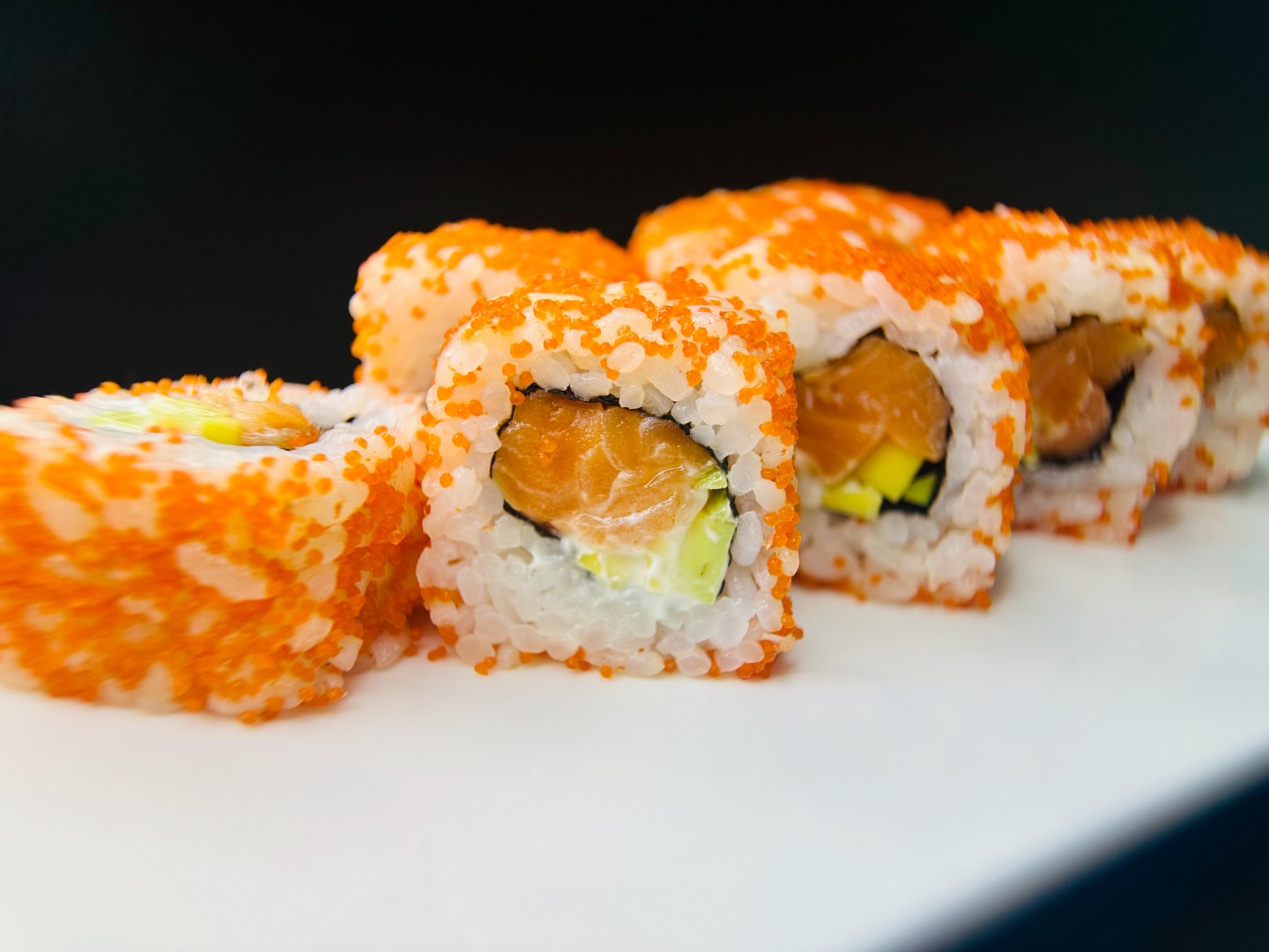 лосось охлажденный, авокадо, майонез, икра масаго. вес: 210 грамм