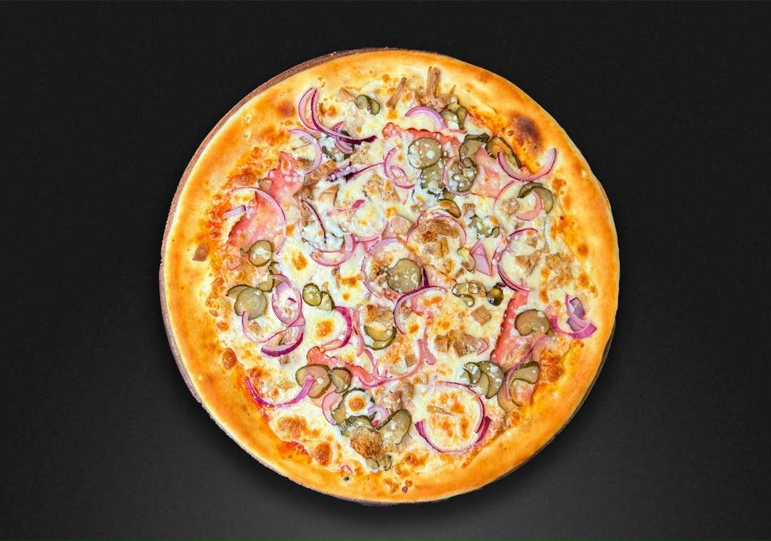Соус итальянский, сыр моцарелла, бекон, свинина отварная, огурчики соленые, красный лук.