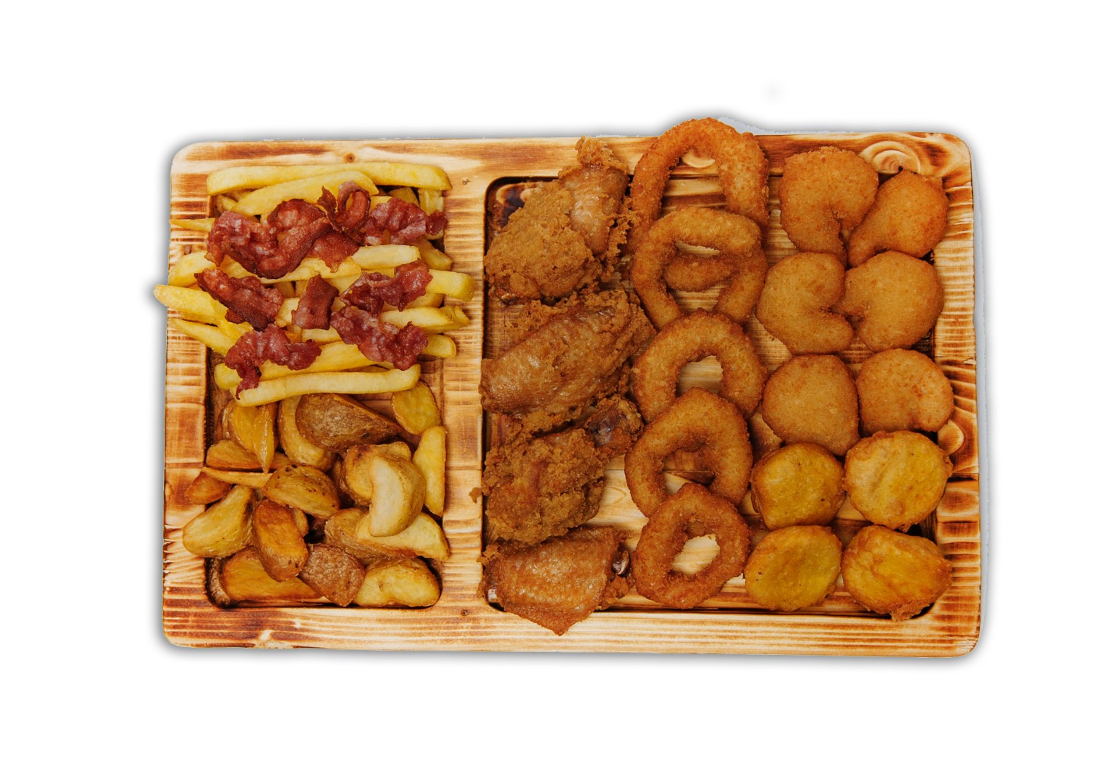 Острые куриные крылышки, Кольца кальмара, Креветки в кляре, Наггетсы, Картофель по-деревенски, Картофель фри с беконом, соус на выбор + 30 руб.
