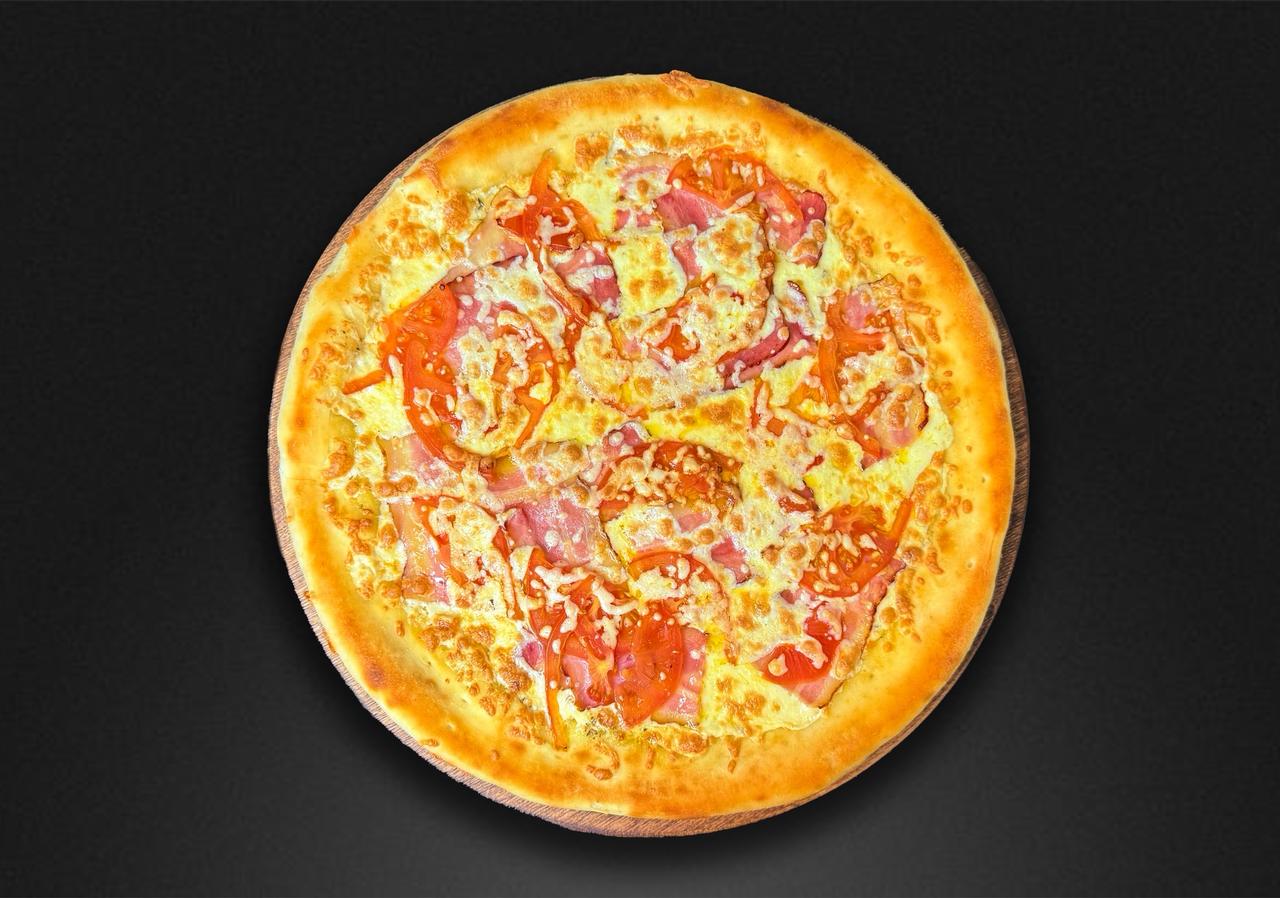 Соус белый, бекон, сыр моцарелла, помидоры.
