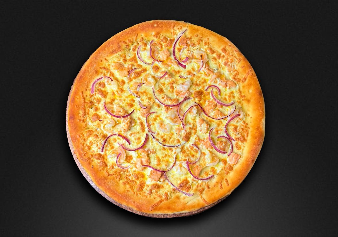 Соус белый, лосось охлажденный, креветки тигровые, сыр моцарелла, красный лук.