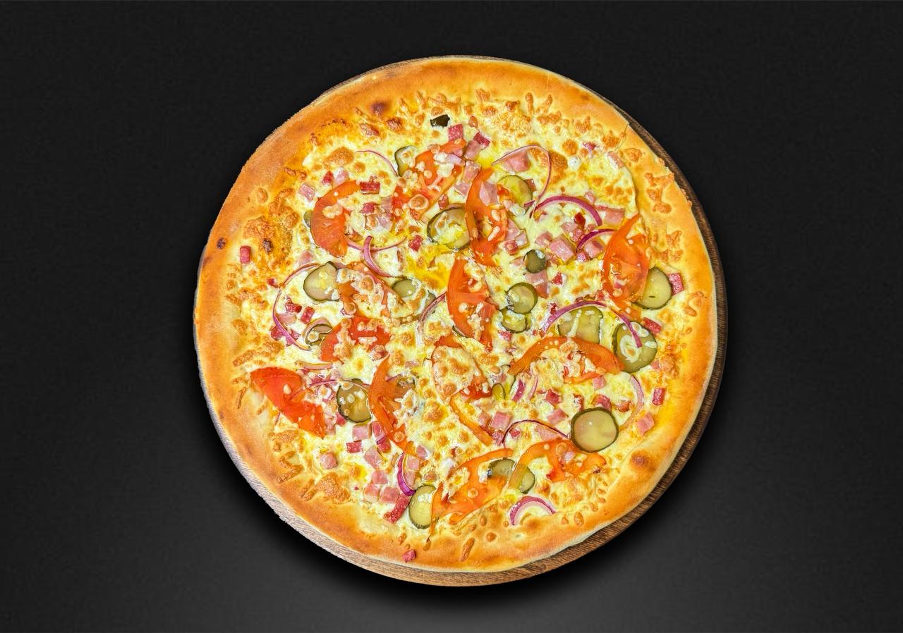 Соус фирменный, сыр моцарелла, колбаса п/к, ветчина, помидоры, огурчики соленые, лук красный.