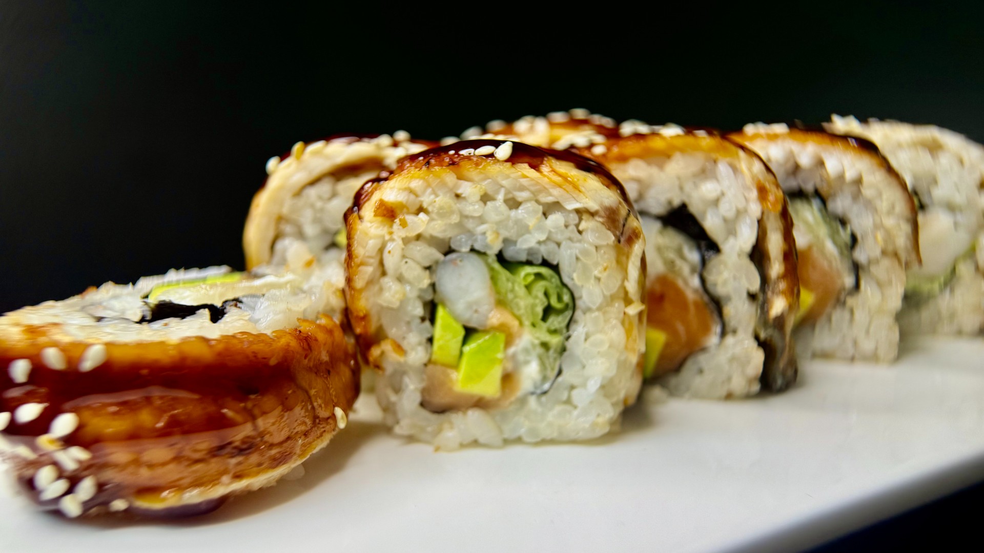 угорь жареный, лосось охлажденный, креветка тигровая, салат айсберг, майонез, авокадо, сверху: соус унаги, кунжут. вес: 270 грамм
