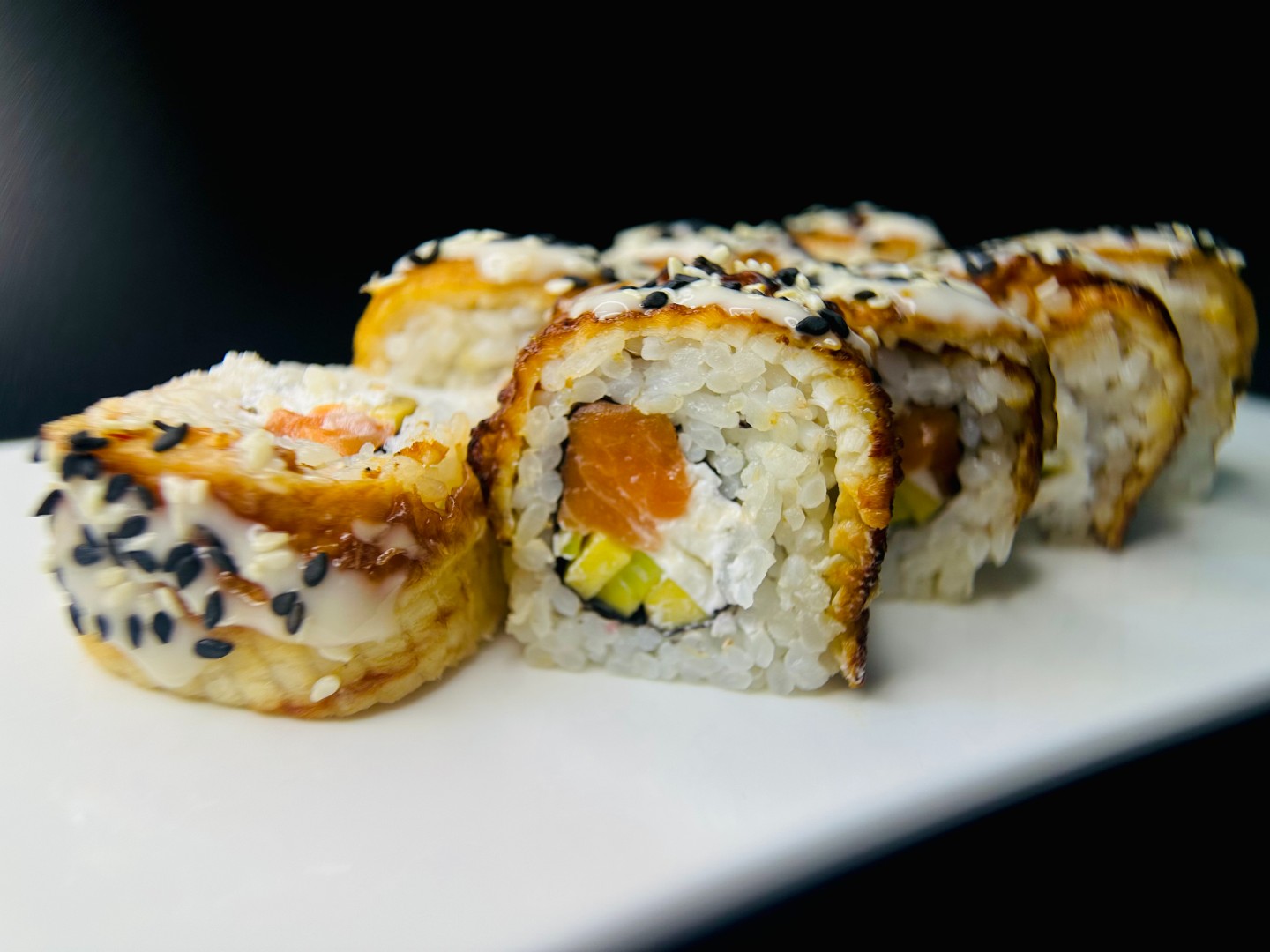 лосось охлажденный, угорь жареный, сыр творожный крем-чиз, авокадо, сверху: соус кунжутный, кунжут. вес: 265 грамм