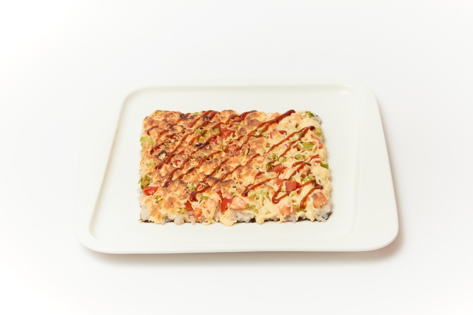 Нори, рис, майонез, лосось, брокколи, помидоры, сыр моцарелла, соус унаги.