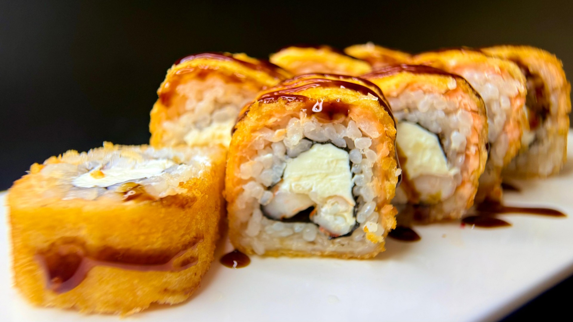 лосось охлажденный, креветка тигровая, сыр творожный крем-чиз, сверху: кляр, сухари панированные, соус унаги. вес: 290 грамм