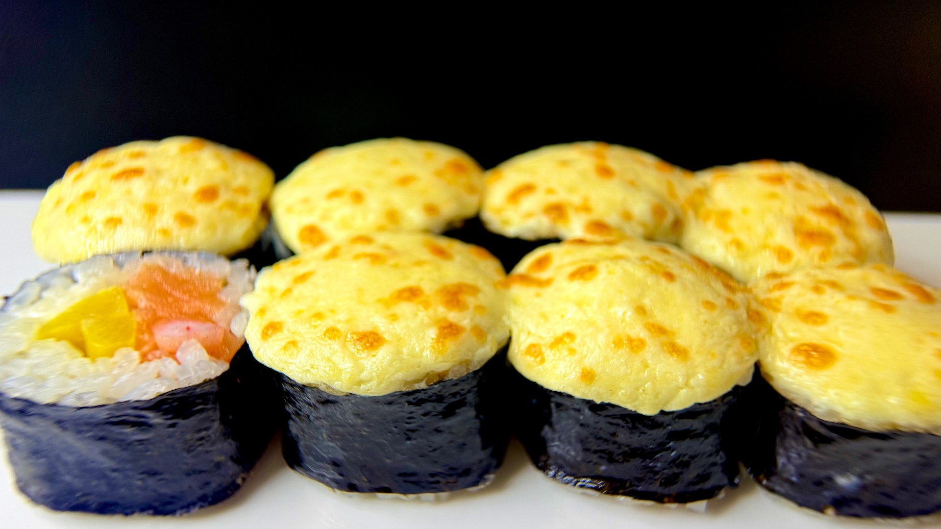 лосось охлажденный, креветка тигровая, дайкон маринованный, майонез. сверху: сырная шапочка. вес: 260 грамм